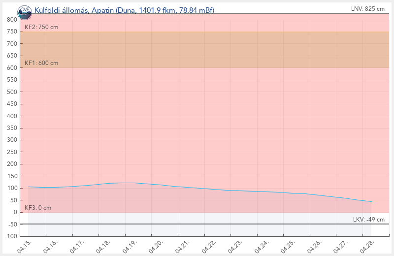 Nagybajcs(06:00):43cm   Komárom(06:00):56cm   Esztergom(06:00):36cm   Budapest(06:00):84cm   Paks(06:00):-42cm   Baja(06:00):97cm   Duna Mohács(06:00):116cm