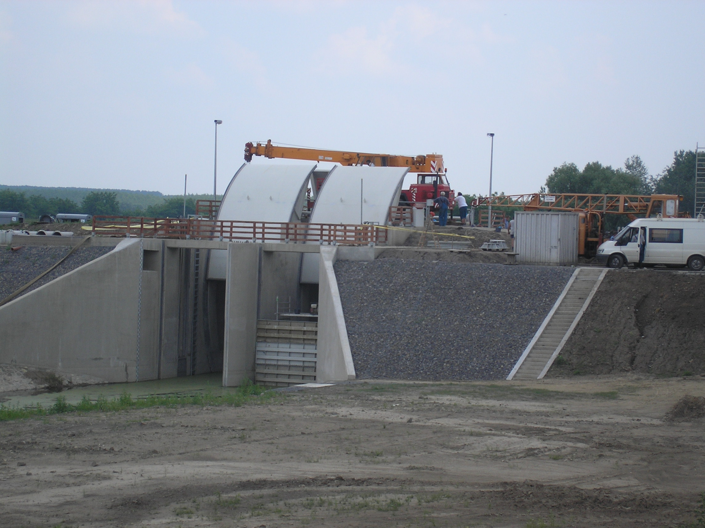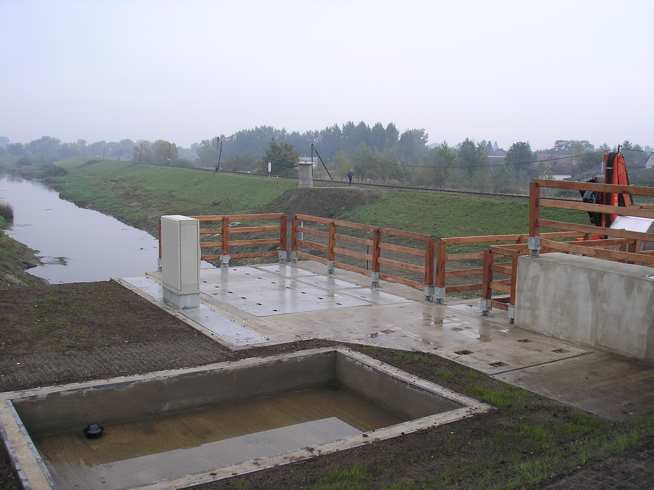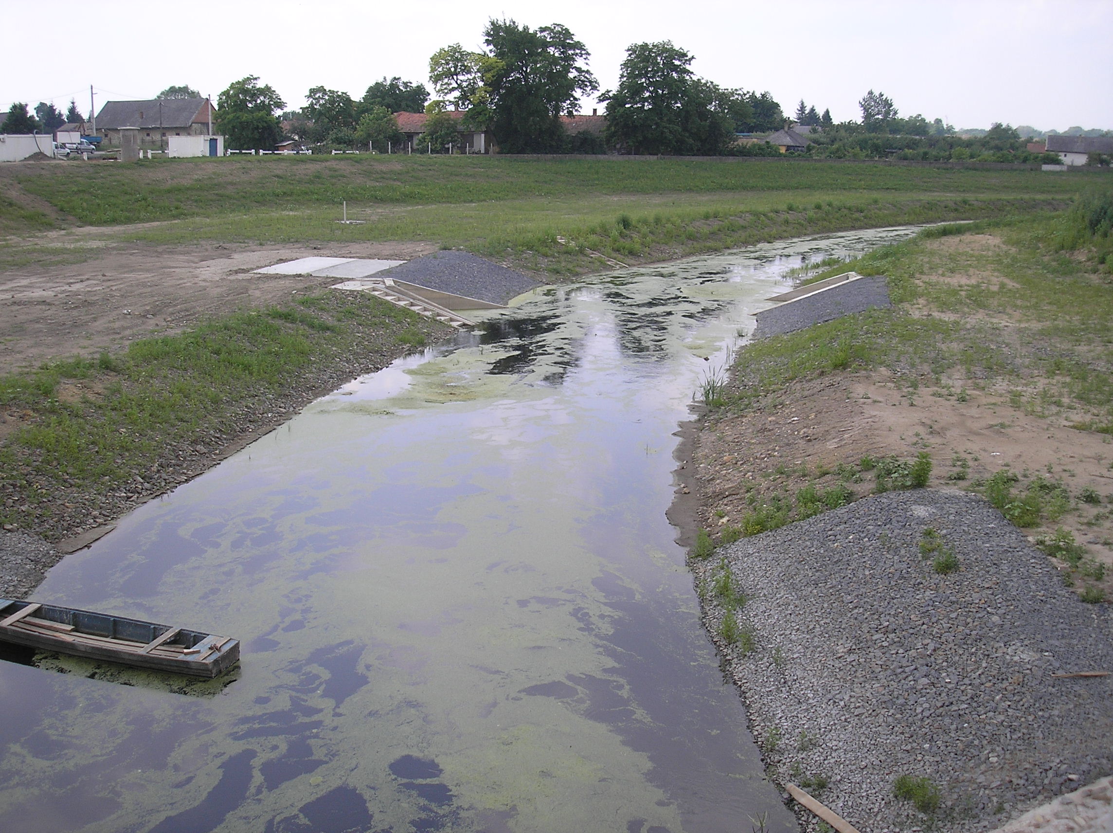A műtárgy kialakítása: 2 nyílású, ?nyitott szelvényű? vasbeton műtárgy (árvízkapu), üzemi átjáróhíddal, szivattyú aknákkal. Az átfolyó nyílások szélessége: 2x4,00 m. A mederfenékkel közel egyező műtárgy fenékszintje/küszöbszintje: 93,40 mBf/93,60 mBf.