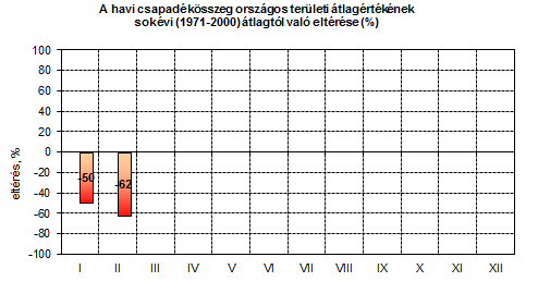 A következő szövegközi ábrán a 2011. január-február időszakra havi bontásban mutatjuk be a csapadékösszeg országos területi átlagértékének relatív eltérését a sokévi középértéktől.