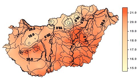 A 2011. június havi középhőmérséklet (°C) területi eloszlása