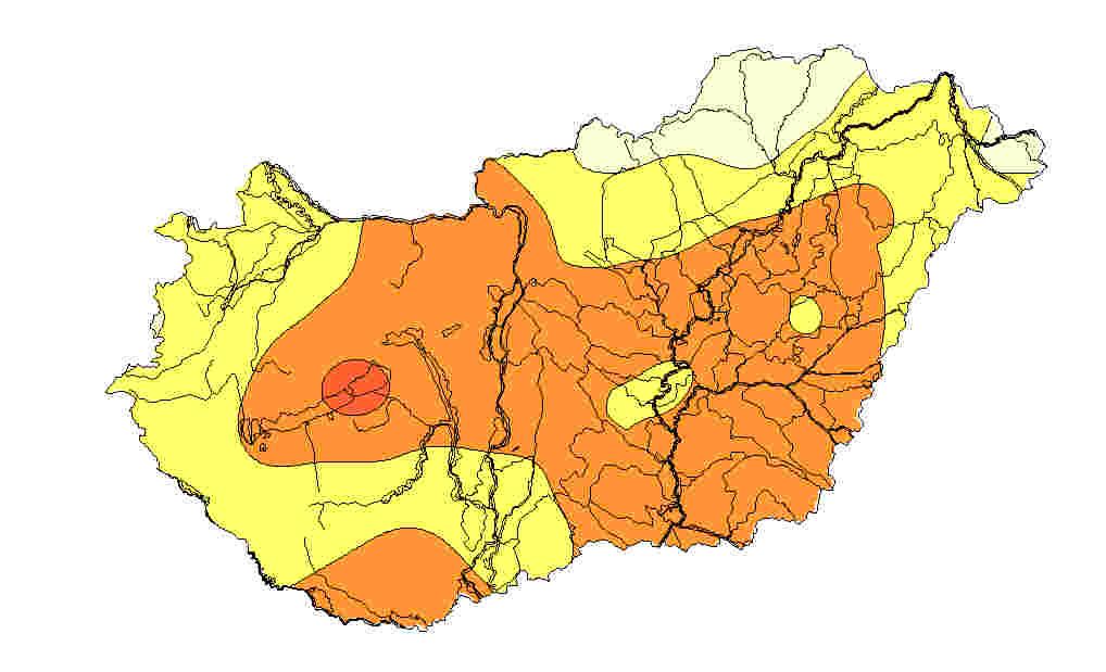 Siófok térségében, a számítások 10,0 fölötti PAI értéket jeleznek, ami már az erős aszály kategóriájába tartozik.
