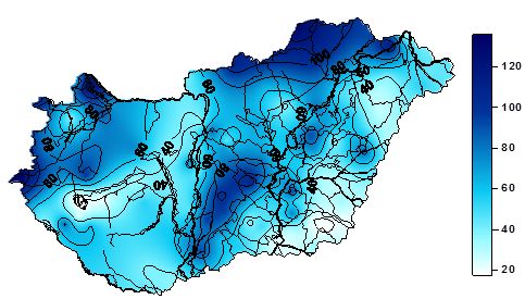 A 2011. június havi csapadékösszeg (mm) területi eloszlása