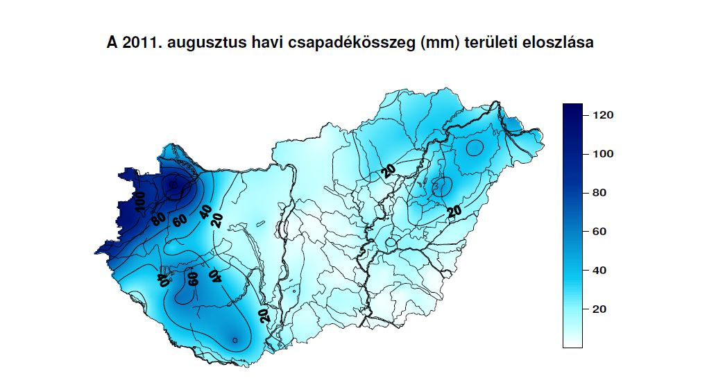 2011 augusztusában a rendelkezésre álló adatok szerint az ország területére lehullott csapadék mennyisége 0 mm (Csanádpalota) [Csongrád m.] és 127 mm (Csorna) között alakult, az országos területi átlagérték 23 mm volt, ami 32 mm-rel (58 %-kal) kevesebb a viszonyítási időszak (1971-2000) augusztus havi átlagánál.