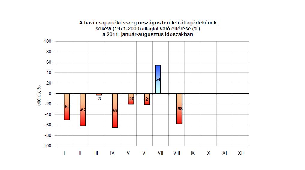Országos áttekintésben az átlaghoz viszonyított legnagyobb nyolchavi csapadékhiány (200-287 mm) a Délnyugat-Dunántúlon, a legnagyobb csapadéktöbblet (50-130 mm) a Hajdúság területén alakult ki.