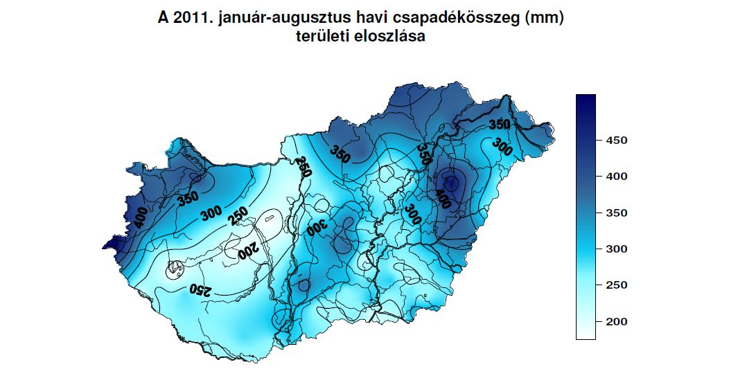 A 2011. január-augusztus nyolchavi csapadékösszeg 174 mm (Balatonmagyaród 4T) és 514 mm (Szentgotthárd-Farkasfa) között alakult, az országos területi átlagérték 297 mm volt, amely az időszakos átlagnál 89 mm-rel (23 %-kal) alacsonyabb.