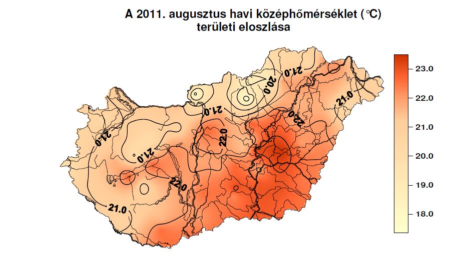 A havi középhőmérséklet az ország egész területén az átlagos augusztusi érték felett alakult,