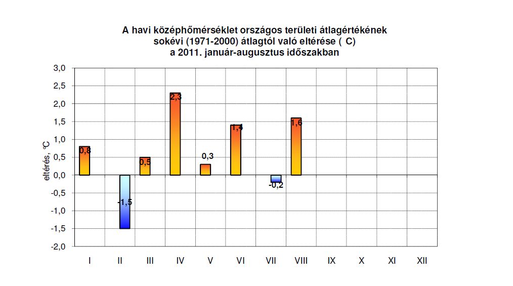 Az alábbi szövegközi ábrán a havi középhőmérséklet országos területi átlagértékeinek idei alakulását szemléltetjük.