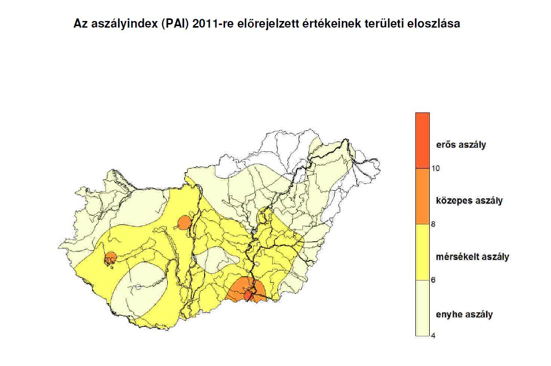 Az aszályindex (PAI) számításánál az augusztus az utolsóként figyelembe veendő hónap, így most be tudjuk mutatni az index 2011 évi értékeinek területi eloszlását.