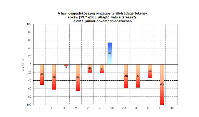 Az alábbi ábrán a 2011. január-november időszakban lehullott csapadék mennyiségének területi eloszlását szemléltetjük. A tizenegy havi csapadékösszeg 222 mm (Agárd) és 642 mm (Szentgotthárd-Farkasfa) között alakult, az országos területi átlagérték 346 mm volt, amely az időszakos átlagnál 177 mm-rel (34 %-kal) alacsonyabb.