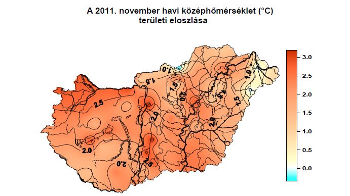 A havi középhőmérséklet az ország egész területének túlnyomó részén elmaradt átlagos novemberi értéktől.