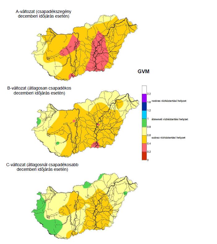 A decemberre előrejelzett GVM-értékek térképszerű feldolgozását a következő ábrán mutatjuk be. Ennek tanúsága szerint 2011 decemberében az ország középső és déli részéin, leginkább a Tisza mentén, szokatlanul száraz vízháztartási helyzet várható még az átlagosnál esetleg csapadékosabb december esetén is (C-változat). Az OMSZ hosszú távú időjárás előrejelzése alapján az A-változat (csapadékszegény december) bekövetkezésének van nagyobb esélye. Száraz decemberi időjárás esetén síkvidéki területeinknek közel a felén 0,4 alatti GVM értékek várhatók!
