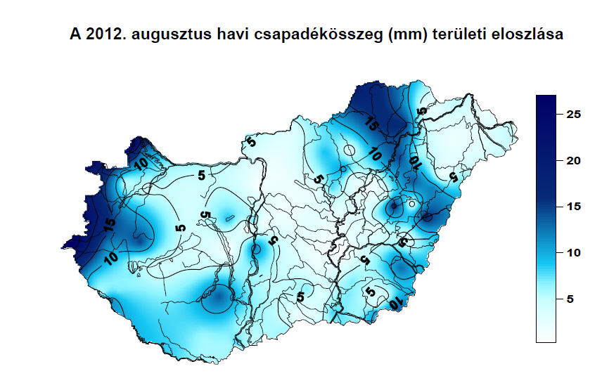 2012 augusztusában a rendelkezésre álló adatok szerint az ország területére lehullott csapadék mennyisége 0 mm (Adony) [Fejér m.] és 27 mm (Szentgotthárd-Farkasfa) között alakult, az országos területi átlagérték 7 mm volt, ami 48 mm-rel (85%-kal) maradt el a viszonyítási időszak (1971-2000) augusztus havi átlagától.