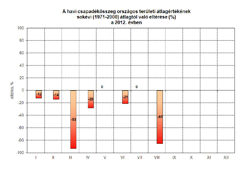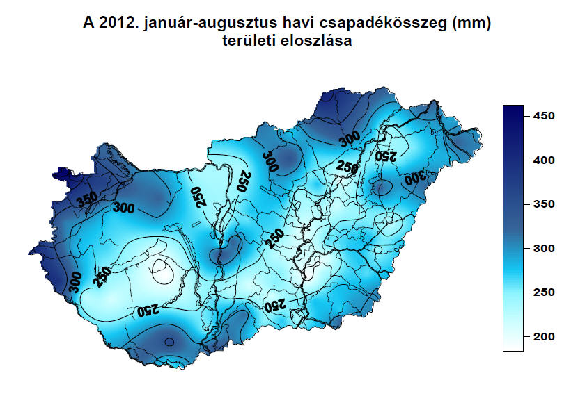 A 2012. január-augusztus nyolchavi csapadékösszeg 183 mm (Szentes) és 463 mm (Sopron-Fertőrákos) között alakult, az országos területi átlagérték 271 mm volt, amely az időszakos átlagnál 115 mm-rel (30%-kal) alacsonyabb.