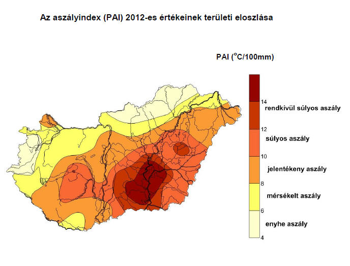 Az áprilistól augusztusig terjedő időszakra - lényegében a mezőgazdasági évre - vonatkozó aszályindex (PAI) országos területi eloszlását a következő ábra mutatja. Megállapítható, hogy az aszály az ország szinte teljes területére kiterjedt, de az ország északi és nyugati peremterületein csak enyhe, illetve mérsékelt formában jelentkezett, míg másutt (az összterület mintegy háromnegyed részén) jelentékeny, súlyos, illetve rendkívül súlyos aszály alakult ki.