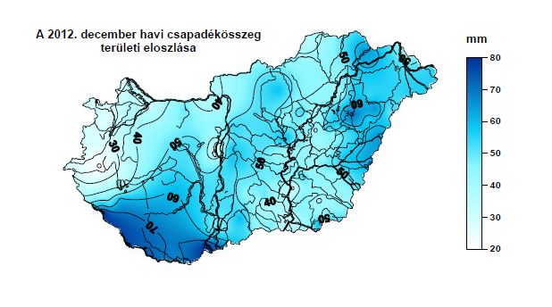 2012 decemberében a rendelkezésre álló adatok szerint az ország területére lehullott csapadék mennyisége 19 mm (Zalaegerszeg-Nagykutas) és 80 mm (Kölked, Murakeresztúr) között alakult, az országos területi átlagérték 48 mm volt, ami 5 mm-rel (12 %-kal) több a viszonyítási időszak (1971-2000) december havi átlagánál.