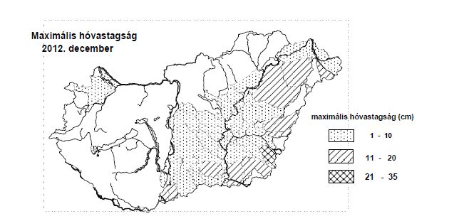 A decemberi csapadék egy része hó formájában érkezett, és az ország síkvidéki területein is átmenetileg összefüggő hótakaró alakult ki. 10 cm-t meghaladó maximális hóvastagságokat síkvidéken a Dél-Dunántúlon, valamint az Alföld és déli és keleti részén jegyeztek fel. Síkvidéken a maximális hóvastagság (34 cm) Kölked [Baranya m.] állomáson fordult elő.