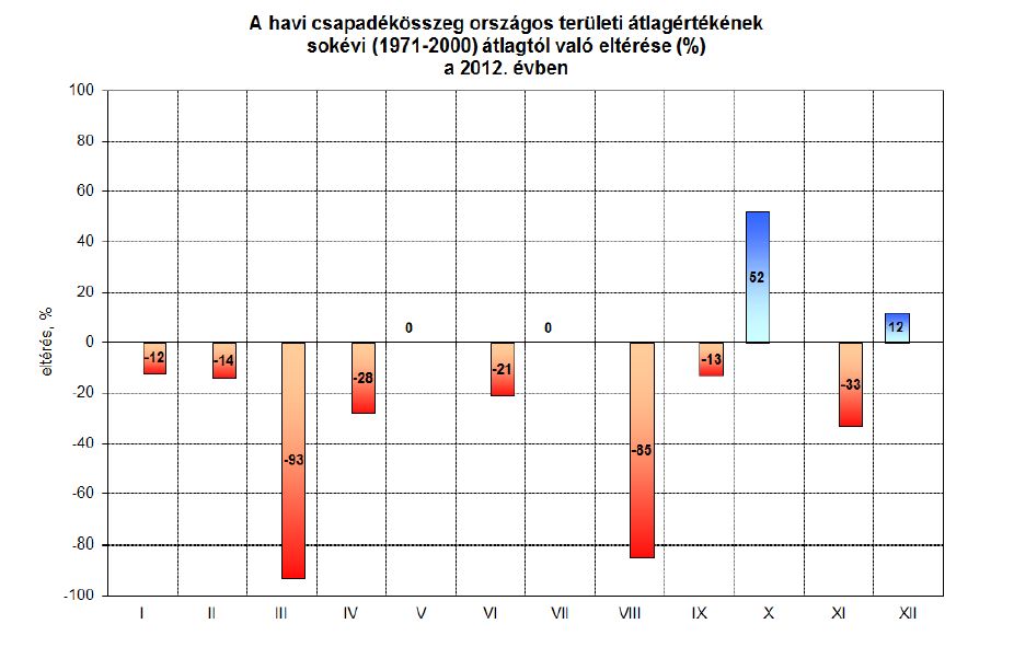 A következő szövegközi ábrán a 2012. évre vonatkozóan havi bontásban mutatjuk be a csapadékösszeg országos területi átlagértékének relatív eltérését a sokévi középértéktől.