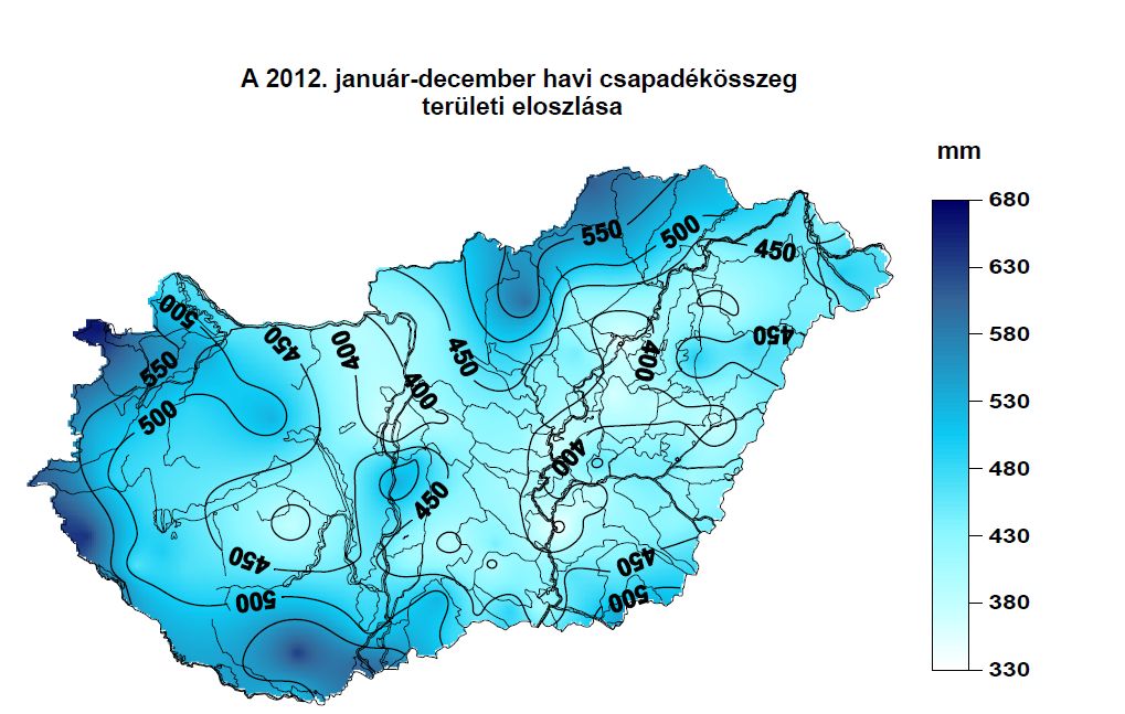 A 2012. január-december időszakban lehullott csapadék mennyisége 335 mm (Szentes) és 667 mm (Sopron-Fertőrákos) között alakult, az országos területi átlagérték 456 mm volt, ami az időszakos átlagnál 109 mm-rel (19 %-kal) alacsonyabb.