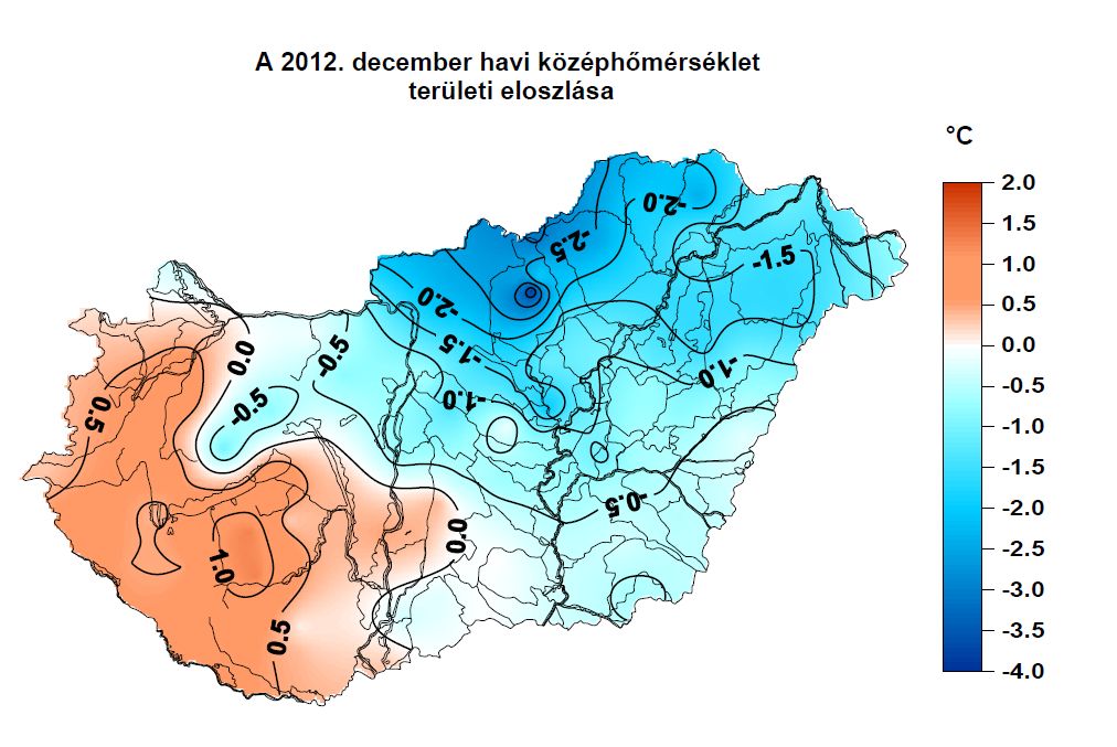 Országos áttekintésben a december havi középhőmérséklethez viszonyított legnagyobb negatív eltérés (2,3°C) Tésa [Pest m.], a legnagyobb pozitív eltérés (0,4°C) Iklódbördőce [Zala m.] állomáson fordult elő.
