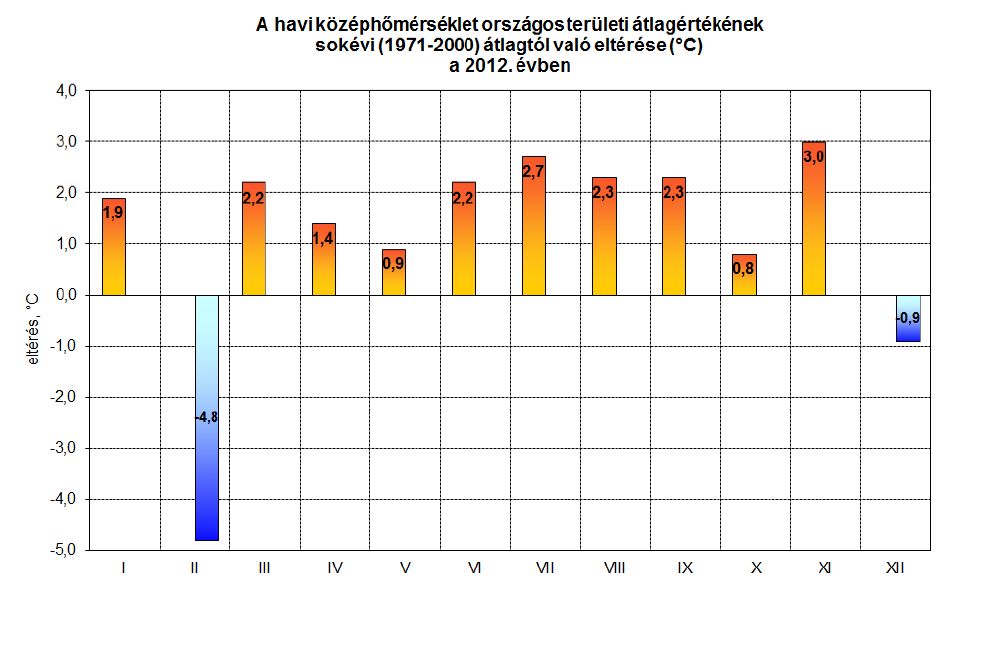 Az alábbi ábrán a havi középhőmérséklet országos területi átlagértékeinek 2012. évi alakulását szemléltetjük.
